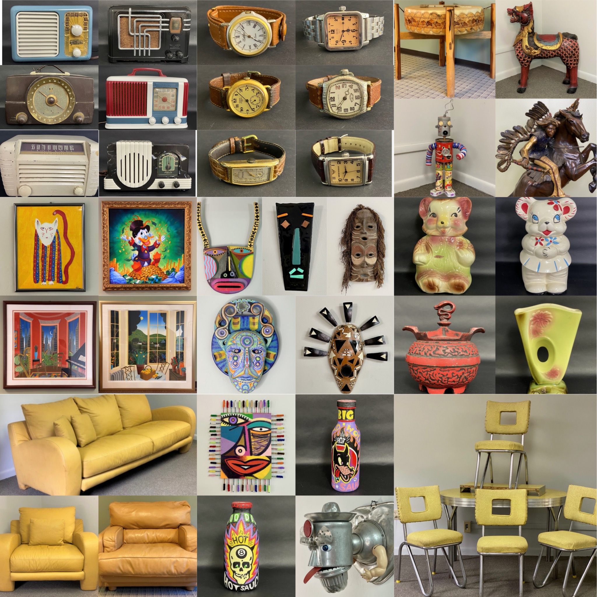 A fantastic array of vintage collectibles including old tube table radios, original artwork including a limited edition signed Obama Lincoln by Ron English, vintage men's watches, collectible vintage furniture and much, much more. Happy Bidding!