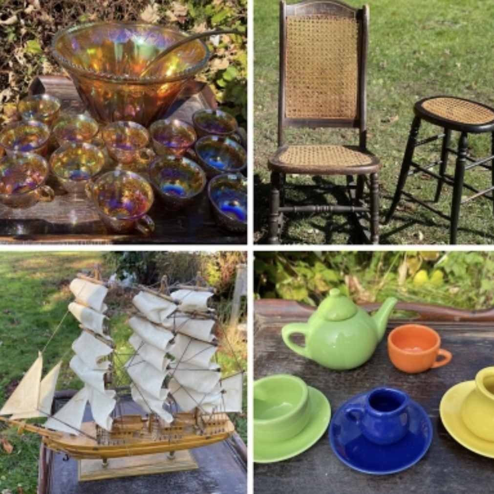 This is a mix of items from a lovely couple in Winsted CT who are lifelong collectors and treasure hunters. They are slowly starting to downsize. A mix of beautiful pieces of decor, glassware, tons of colored glass, vintage bar sets, toys, cameras, radios, McCoy, carnival glass, books, Christmas items, S Bent Bros, chairs, cane furniture, wooden ships and so much more!