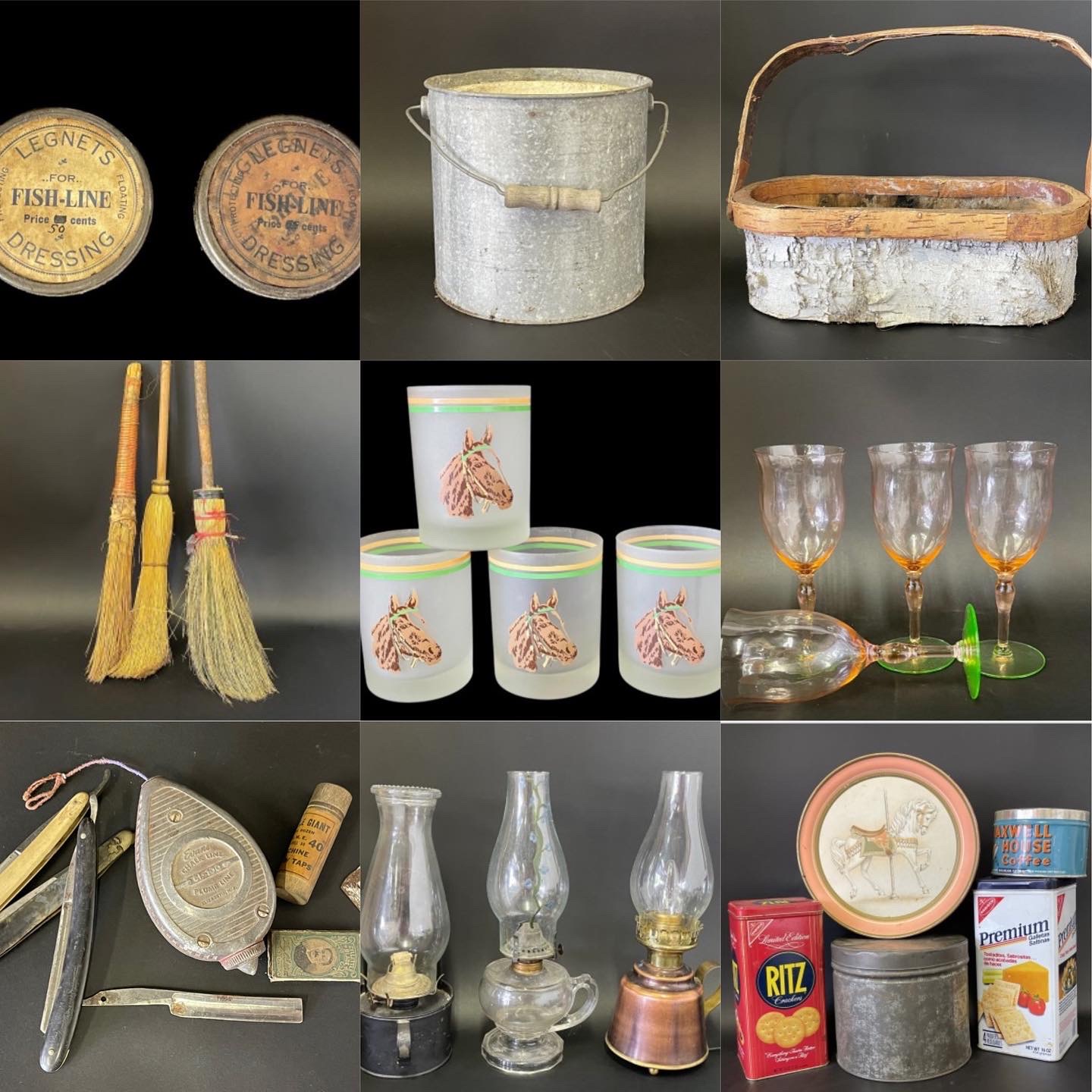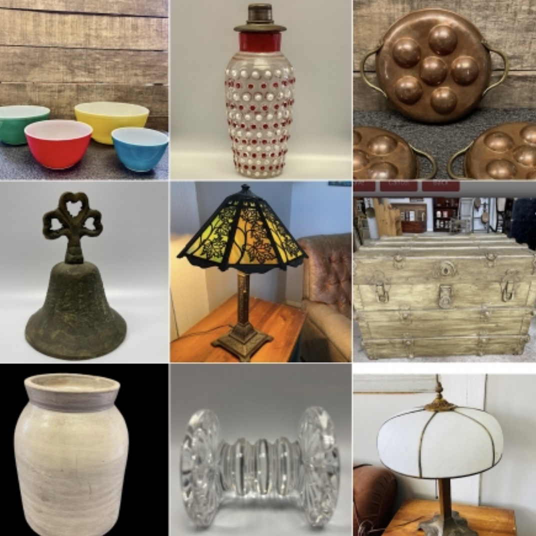 This is a mix of items from our showroom and some clean outs we have done for customer’s downsizing and relocating. There are so many wonderful pieces — a mix of rustic decor, horse decor, Native American themes, vintage glassware, cocktail items, copper, brass, kitchenware, pottery, newspapers, bottles, vintage toys, collector plates and so much more!