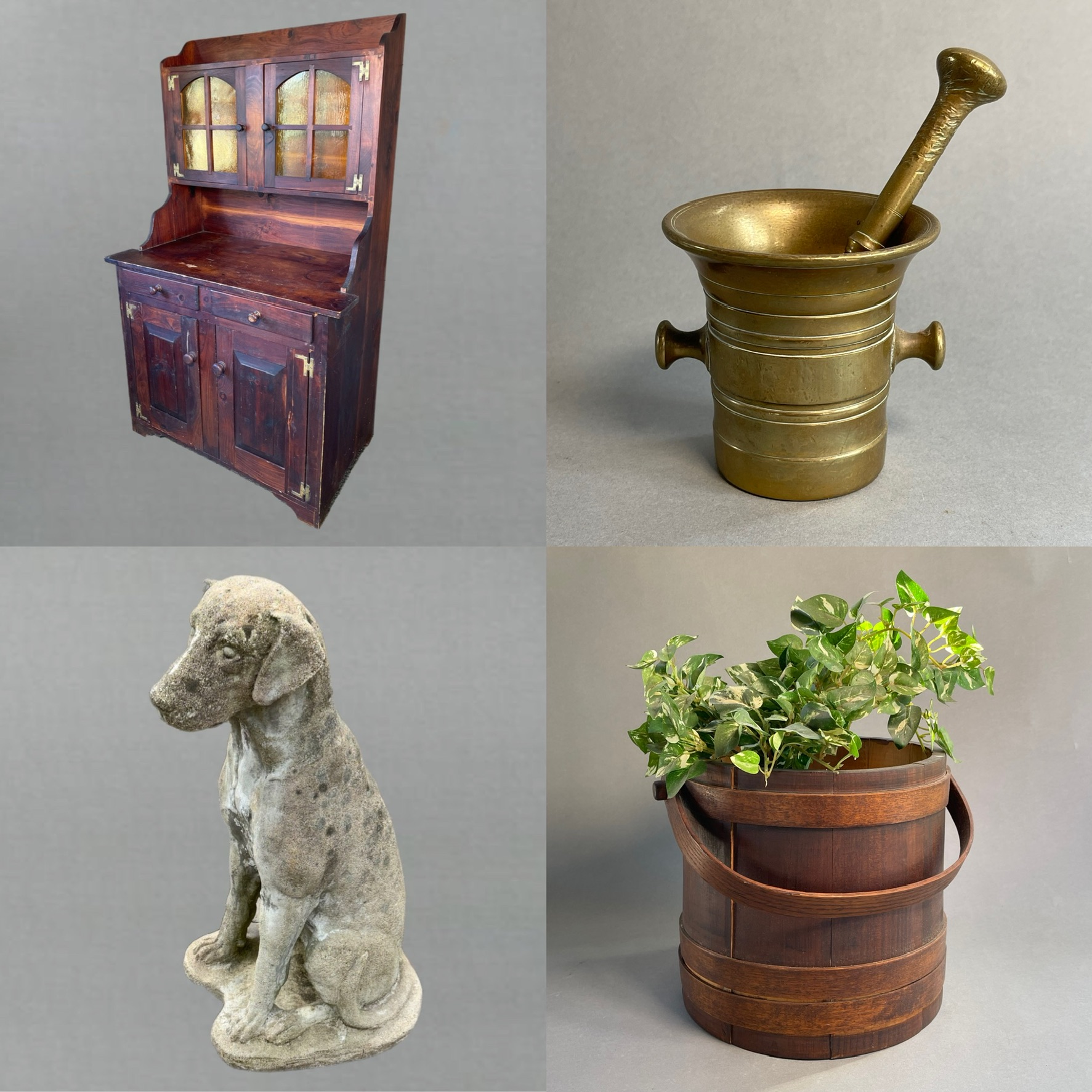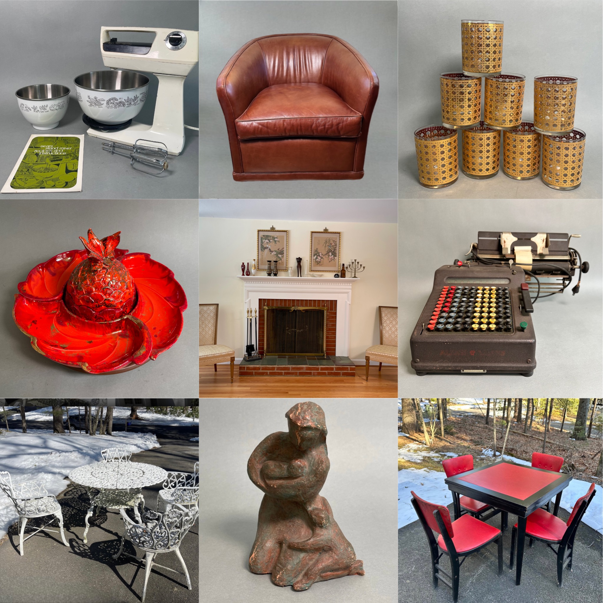 A beautiful Litchfield & Fairfield County Estate downsize with PICK UP IN WINSTED CT This auction is a blend from a beautiful Litchfield estate and an estate in Fairfield County. There are some great primitive pieces, crocks, scales, sad irons, cast iron pieces, cauldrons, metal lawn art, milk glass lamps, blue glass, clocks, antique, modern & vintage tools, lawn equipment, two gorgeous antique mantles and so much more. Don’t miss the two leaf blowers, fall is approaching! Happy Bidding! Reach out if we can help in any way.