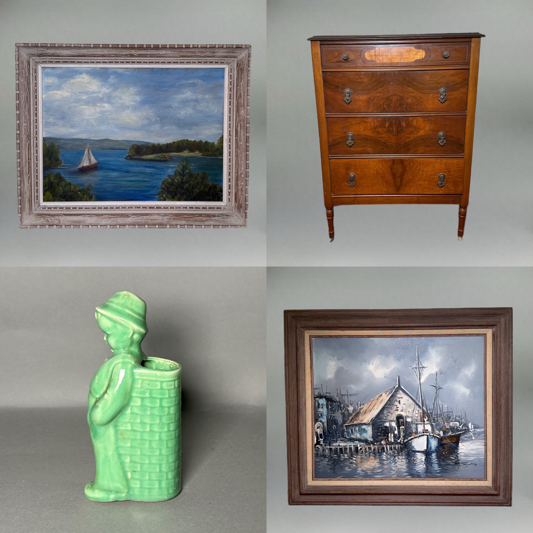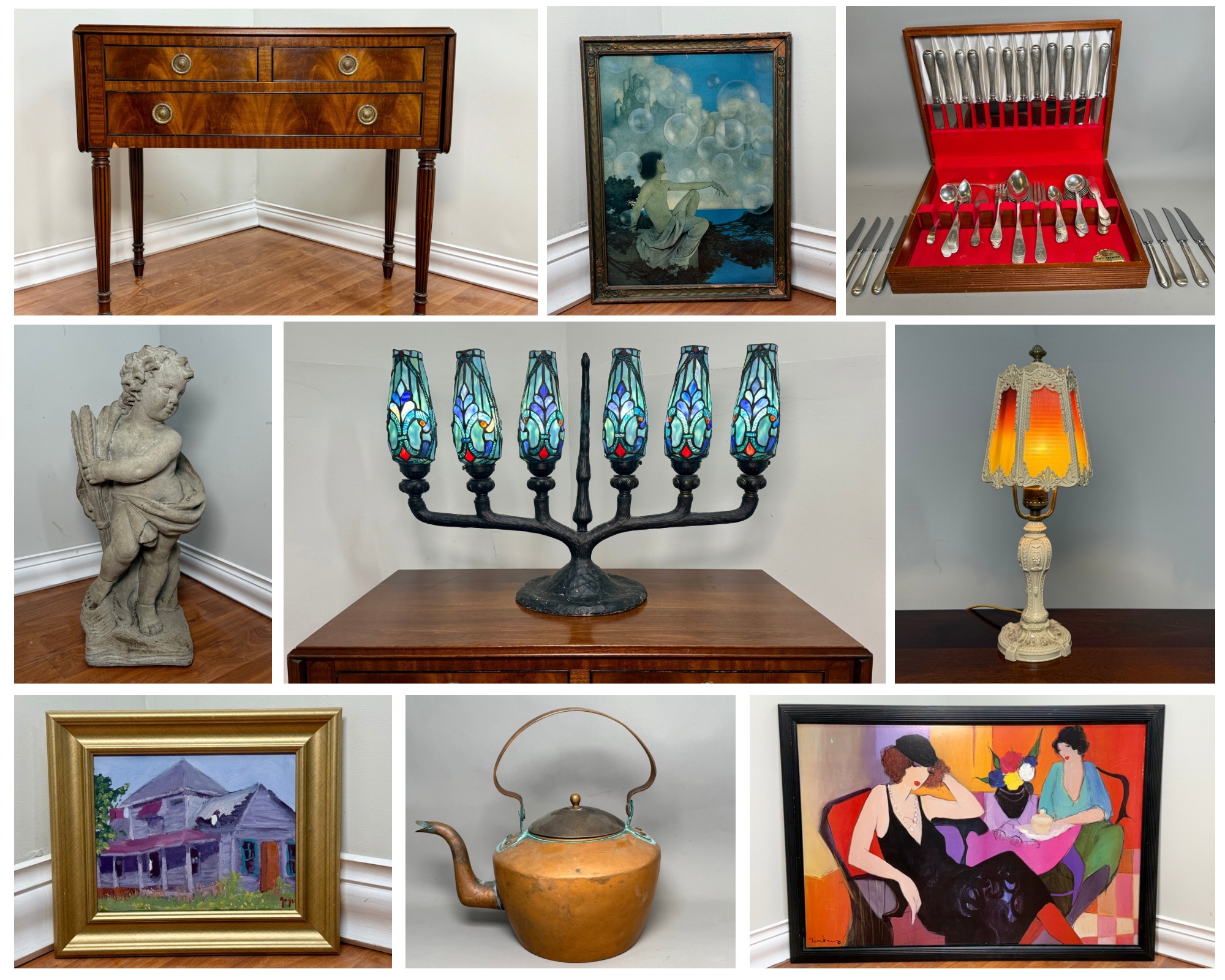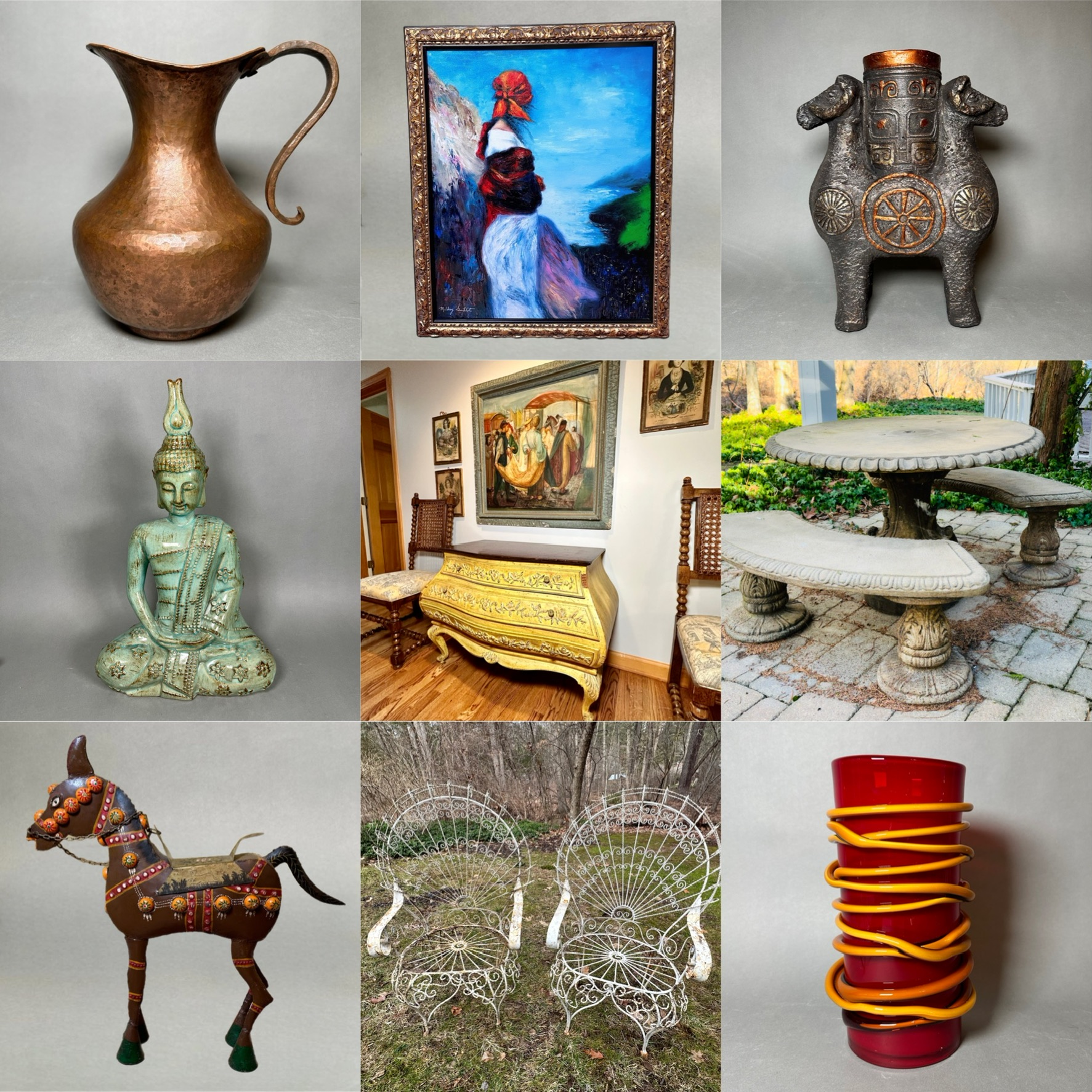 Explore a nice mix of treasures including over 7000 grams of sterling silver, beautiful works of art, stunning lamps, jewelry, furniture, decor, antique & vintage collectibles, porcelain, copper and many more treasures. Pick up will be in our warehouse in the Collins Axe Factory. Please reach out with any and all questions! Lauren 860-368-0122 (text is best)