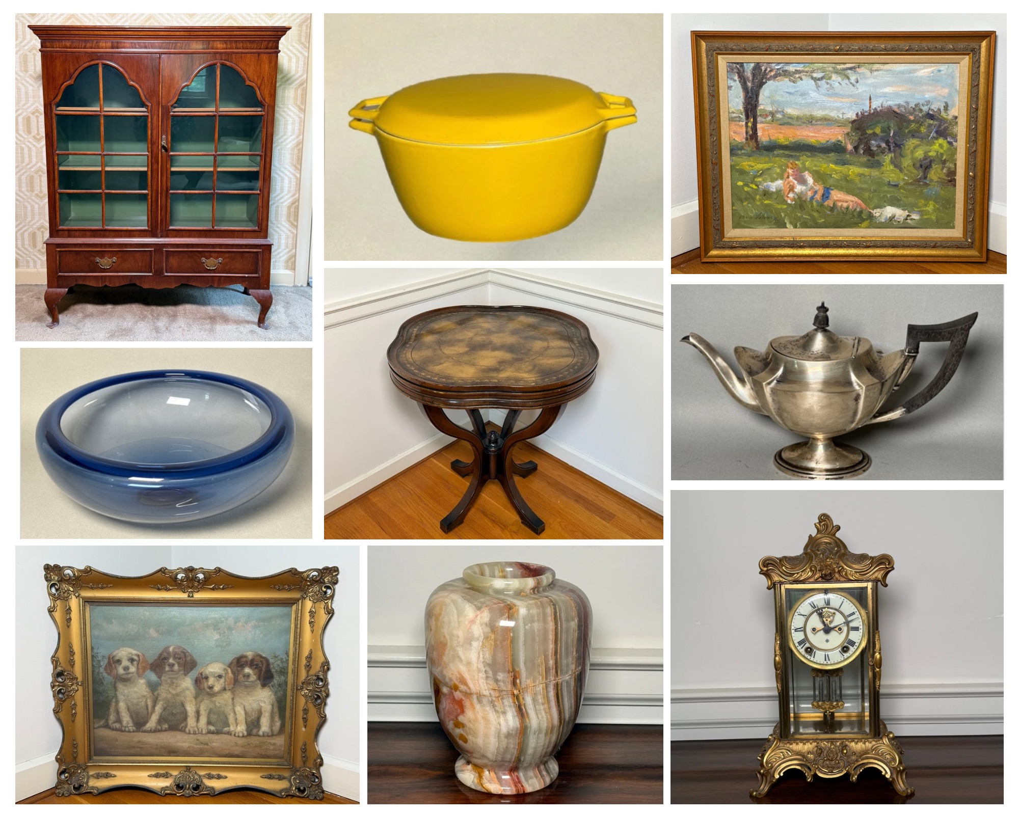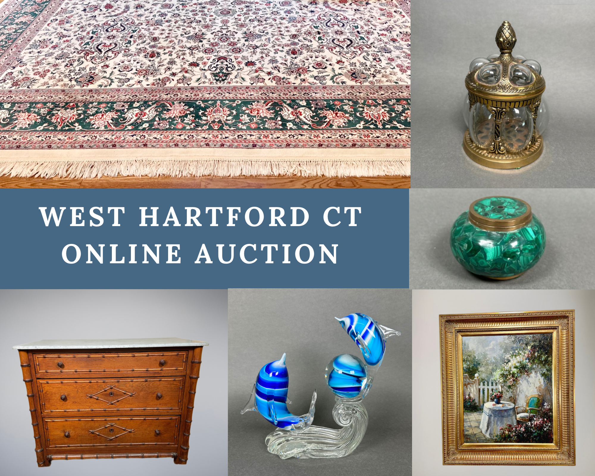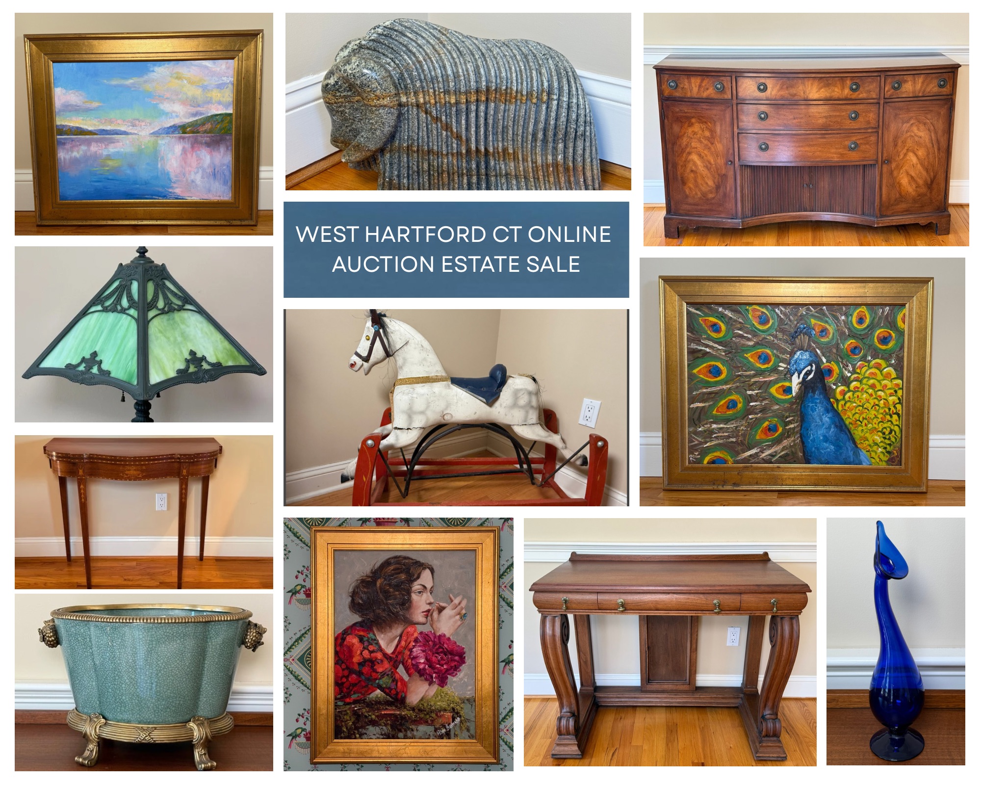 Explore the treasures from this beautiful home in West Hartford CT. This home belongs to the former president & CEO of The Hartford Steam Boiler Inspection & Insurance Company. There is an incredible collection of fine art, antiques, and unique decor. There are many original works of art, including many that are animal/nature related. Unique collectables like an antique Victorian rocking horse glider, a Chinese street food cart warmer, a giant brass bell and more. He lived in Hong Kong and brought back many pieces of beautiful art and hand carved creations. We especially love his passion for bright and colorful fine art that brings warmth to your home. Many of the treasures in this auction are heavy weighted, quality made pieces that were made to last a lifetime. There is also a wonderful collection of gilded mirrors that bring a Victorian feel into your home, as well as many brass, gilded and bronze pieces. The lamps are quality made and there is a beautiful assortment ranging from Stiffel to Tiffany Style Slag Glass. We hope you enjoy exploring this auction and we are here to answer any and all questions. Best Wishes, Chris & Lauren 860-368-0122