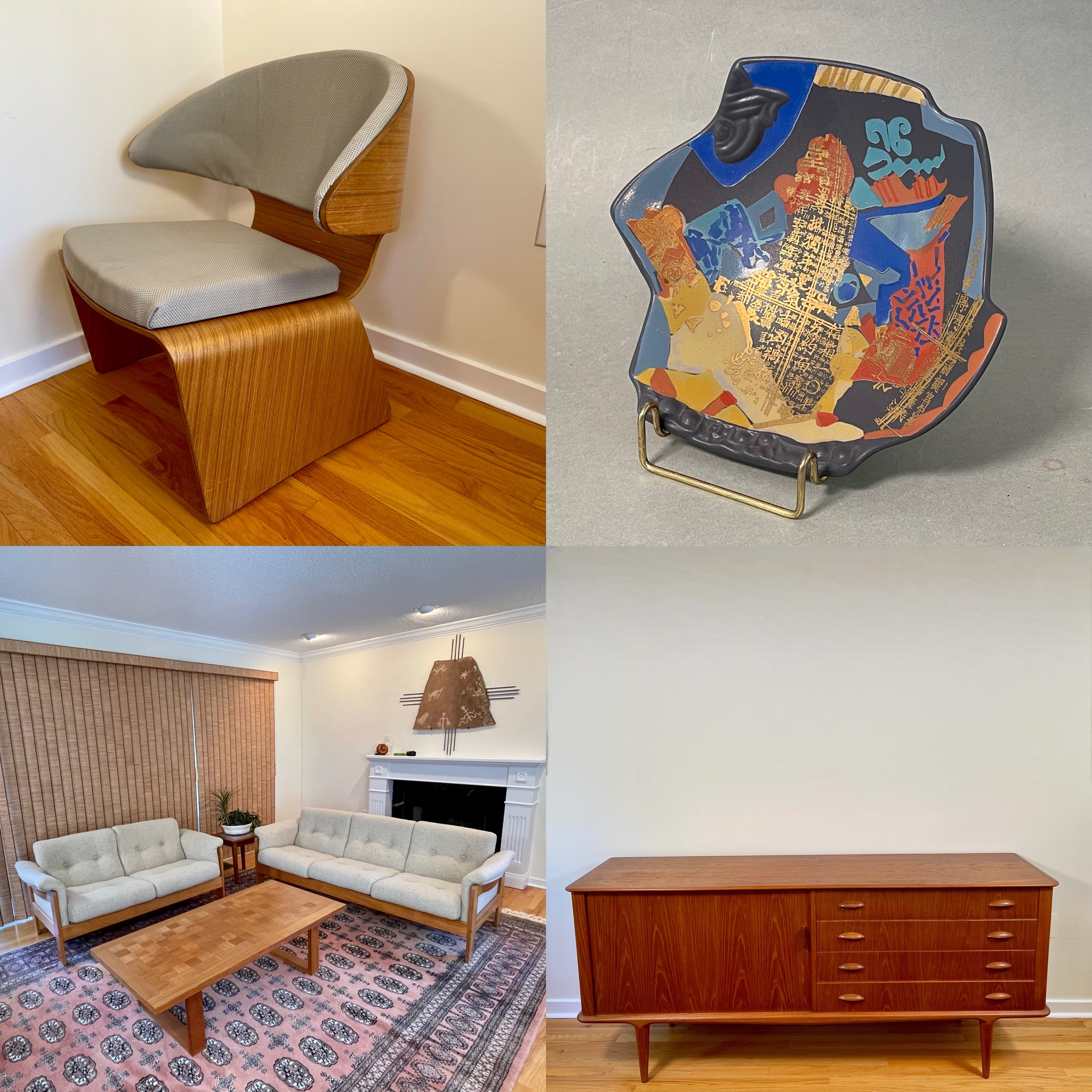 A fantastic collection of treasures that have been beautifully maintained. So many wonderful Danish modern teak furniture pieces including gorgeous sofa and love seat by Niels Eilerson, a mid century Danish modern teak bikini chair designed by Hans Olsen for Frem Rojle, Morredi teak sideboard, Mauser chairs and many more teak pieces. A large rug with amazing wool pile, vintage collectables, art including many Handpainted marble pieces, cameras, watches, fabulous lamps, outdoor table and chairs and many more great items. Always reach out with any questions!
