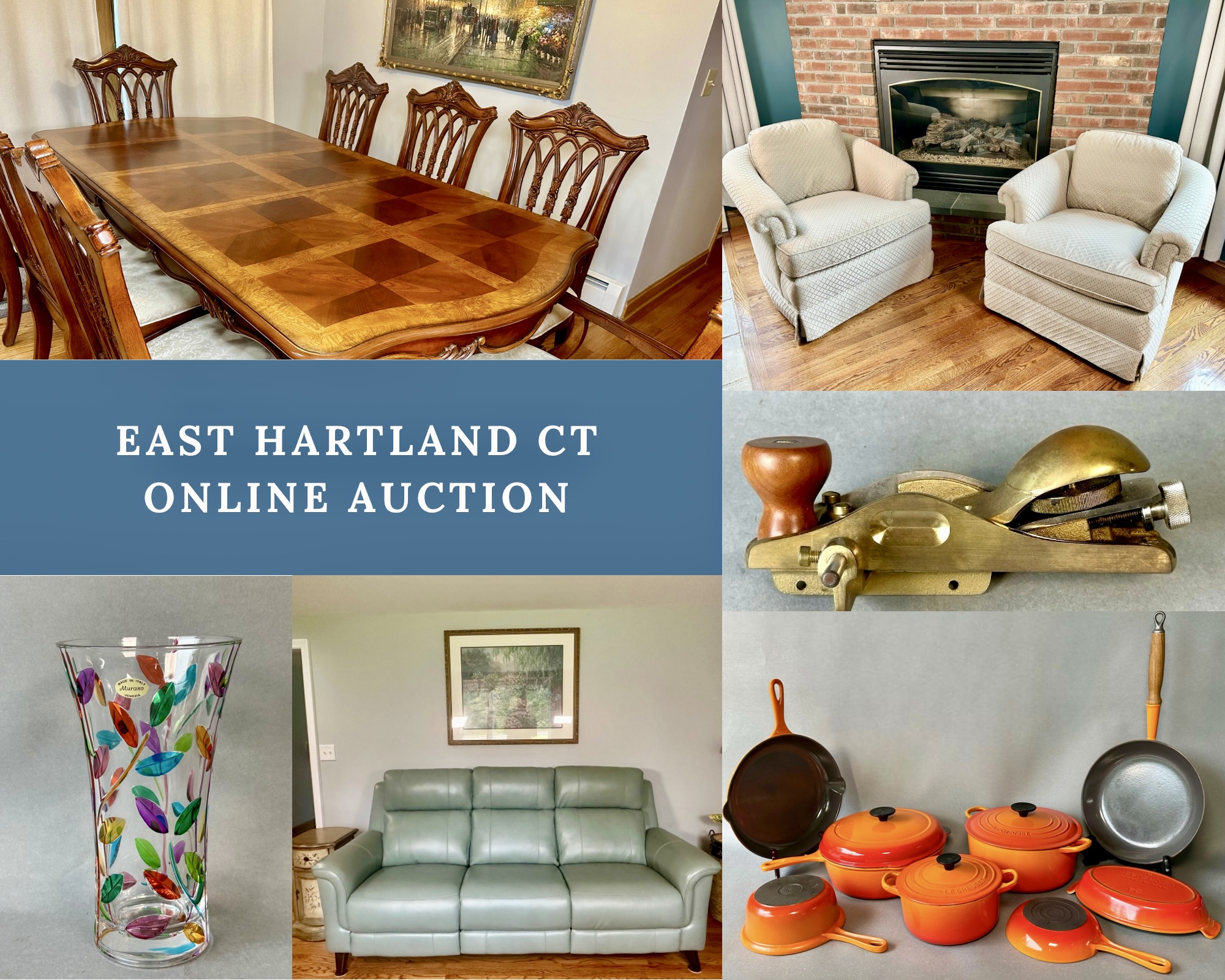 Explore the treasures from a beautiful home in East Hartland CT, filled with beautiful furniture, art, decor, rugs, tools and more. Don’t miss that great orange flame Le Creuset, that fabulous large Parisian scene painting, the leather reclining sofa and more! Please reach out with any and all questions. Best of luck, Chris & Lauren - 860-368-0122