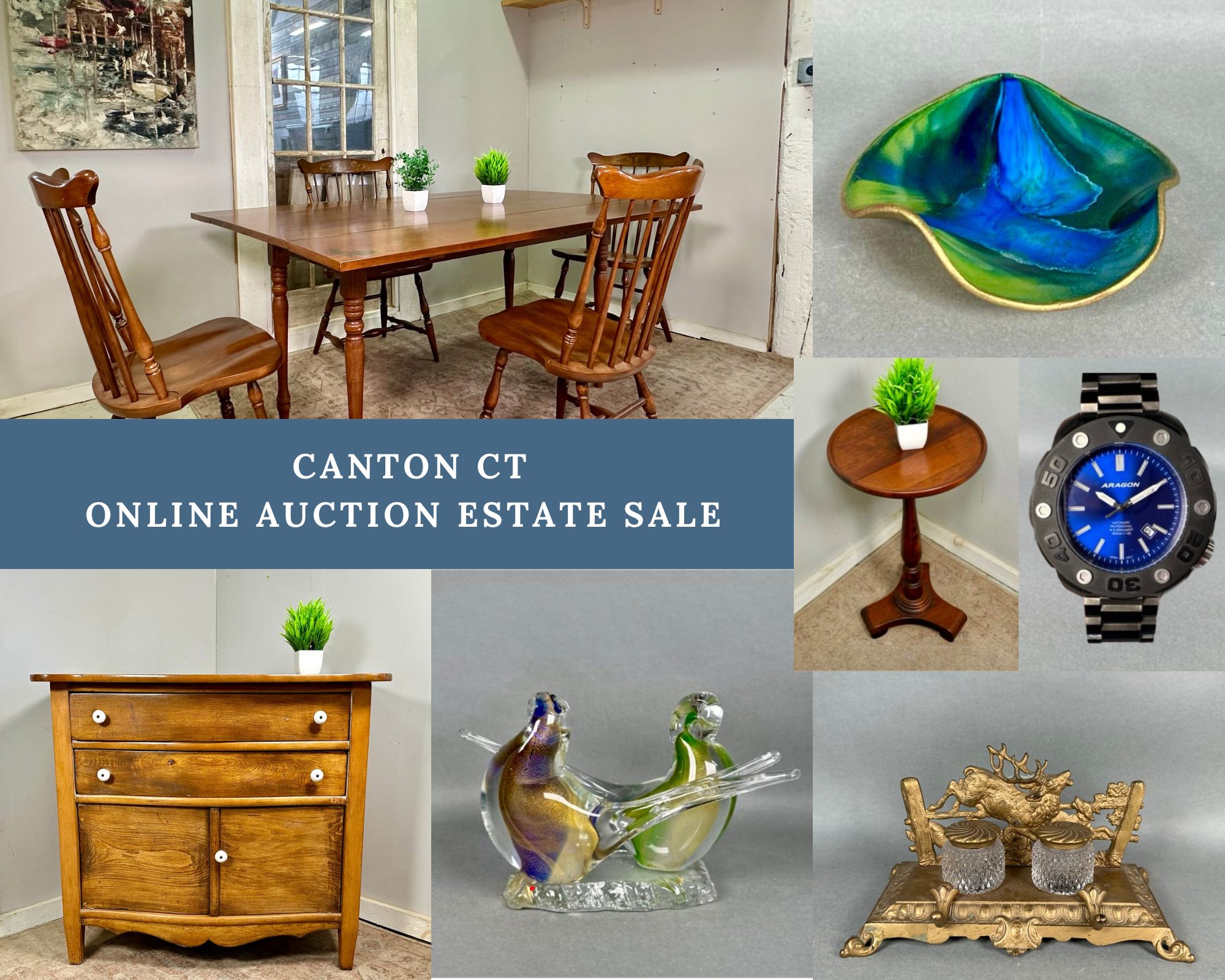 Explore Treasures from the Farmington Valley! A beautiful collection of furniture, gorgeous glassware, vintage and antique collectables, sterling silver, Men’s watches, art, jewelry, trains, carved wood creations, Lenox, Fenton, Waterford Crystal, Baldwin, Royal Doulton and many more treasures. Please note, our retail store is no longer open so pick up will be in our warehouse below our store space. We will have an estate sale in our warehouse during pick up filled with lots of great holiday gift options - vintage toys, tools, trains, jewelry, sports memorabilia, vintage collectables and more. Please reach out with any questions. Best wishes! Chris & Lauren - 860-368-0122