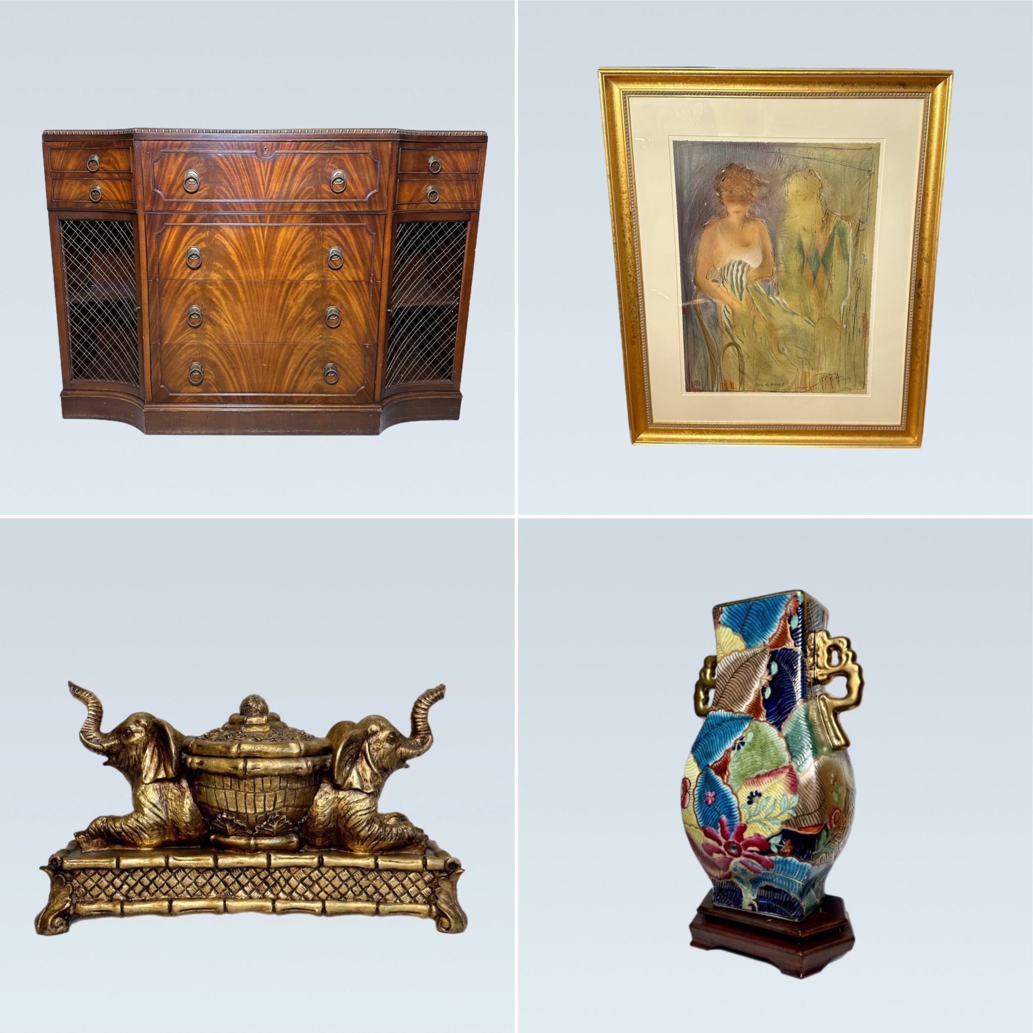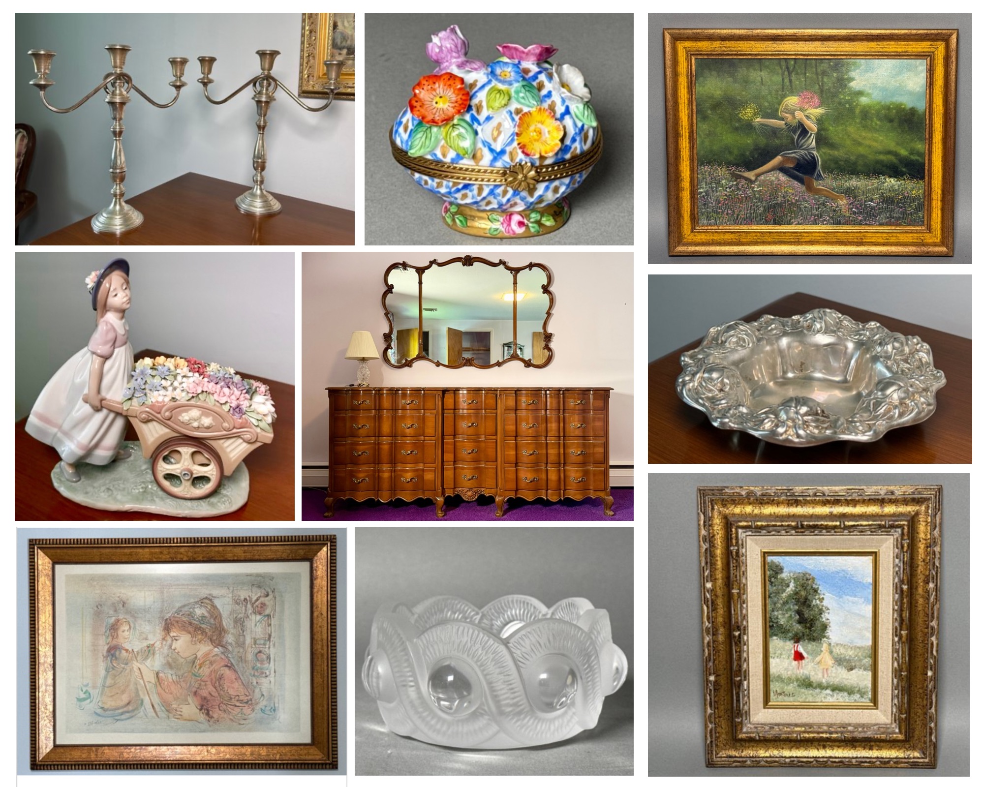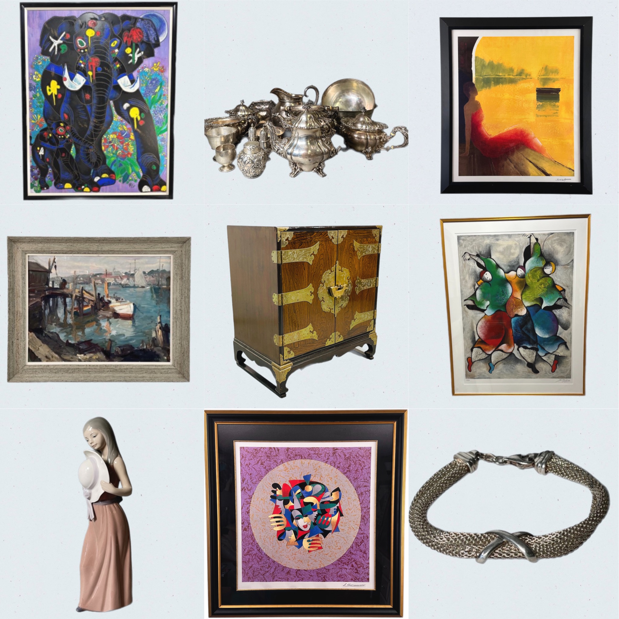 Canton/Collinsville CT We are proud to present this amazing online auction featuring over 15 pounds (220 Troy ounces) of sterling silver pieces, amazing works of art, a collection of lladros in excellent condition, all with their original boxes, a fine assortment of jewelry, a collection of Hummels in excellent condition with original boxes and a few other surprises along the way. Don’t miss those Tiefeng Jiang Serigraphs on unstretched canvas! Amazing works of art from Tarkay, David Schluss, Robert C Gruppe, Jean-Pierre Cassigneul, Michael Delacroix, Farkas, Krasnyansky, Phillipe Alfieri and many more. Extraordinary pieces throughout! Don’t miss the Korean scholar chests. We hope you enjoy exploring our auction and please reach out with any questions! Would you like to come preview these pieces in person? We would love to have you come by our showroom on Monday Nov 14th from 4-6pm at 50 Depot Street in Collinsville CT. We are happy to help in any way we can. Thank you! Chris & Lauren