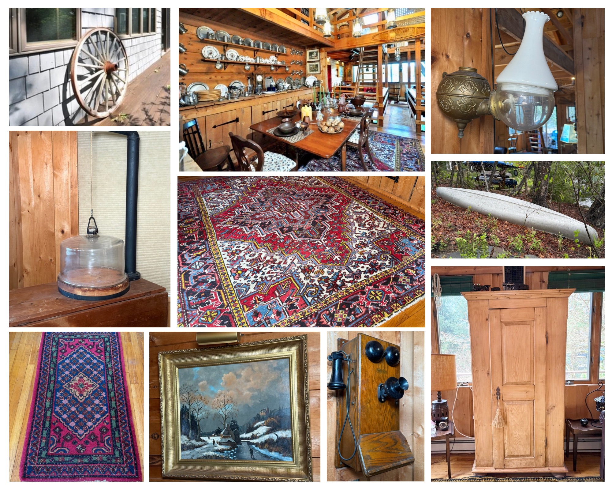 Explore the treasures from this beautifully decorated lake house in Tolland Mass! The home is filled with gorgeous hand knotted rugs, beautiful original art work, lovely primitive furniture, large variety of brass, copper, pewter, cast iron decor, clocks, lamps, unique primitive pieces, outdoor decor, a large 16 foot canoe, concrete planters, lake house decor, chandeliers and many more treasures to explore! Please reach out with any and all questions. Chris & Lauren 860-368-0122