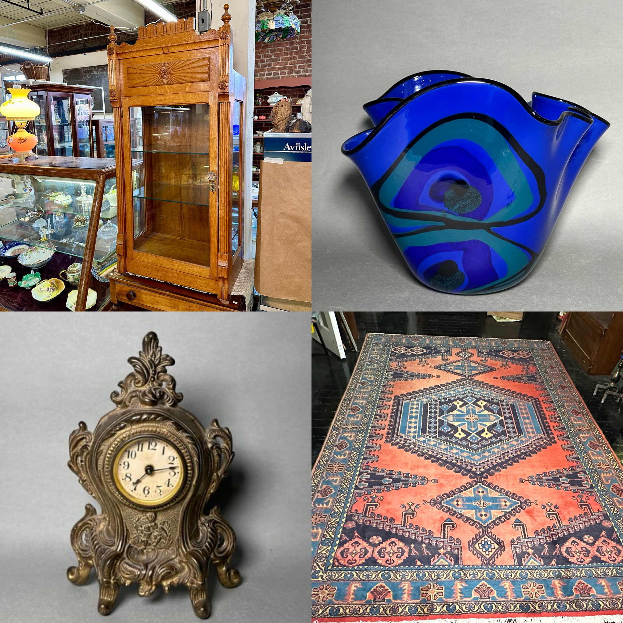 A beautiful mix of antiques, vintage, beautiful furniture, art, jewelry, decor and much more! There are several pieces of colorful Fiesta ware, interesting collectables, quality made metal figurines, carved wood statues, vintage milk glass, lamps, art including original pieces, Swarovski, Baccarrat, Faberge, watches and many more treasures. If you have any questions at all please reach out! 860-368-0122. Best of luck! Chris & Lauren Bridge Street Rustics