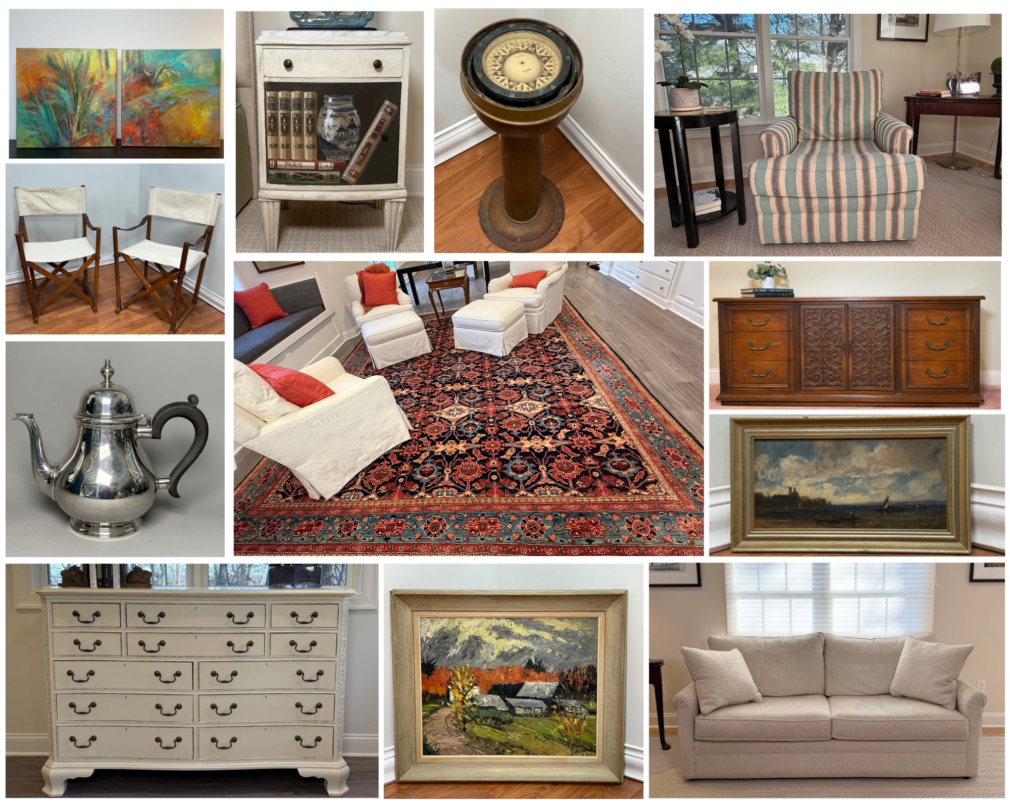 Explore the treasures from this beautiful home filled with gorgeous furniture, works of art, rugs, lamps, decor, nice collection of sterling silver including a Tiffany & Company flatware set for twelve, Christmas decor, antique and vintage collectibles, Martha’s Vineyard artisan creations, hand painted nightstands by Tom Rose, authentic Mogens Koch safari chairs, crystal, glassware, housewares and much more. Please reach out with any questions! Chris & Lauren 860-368-0122 - text is best