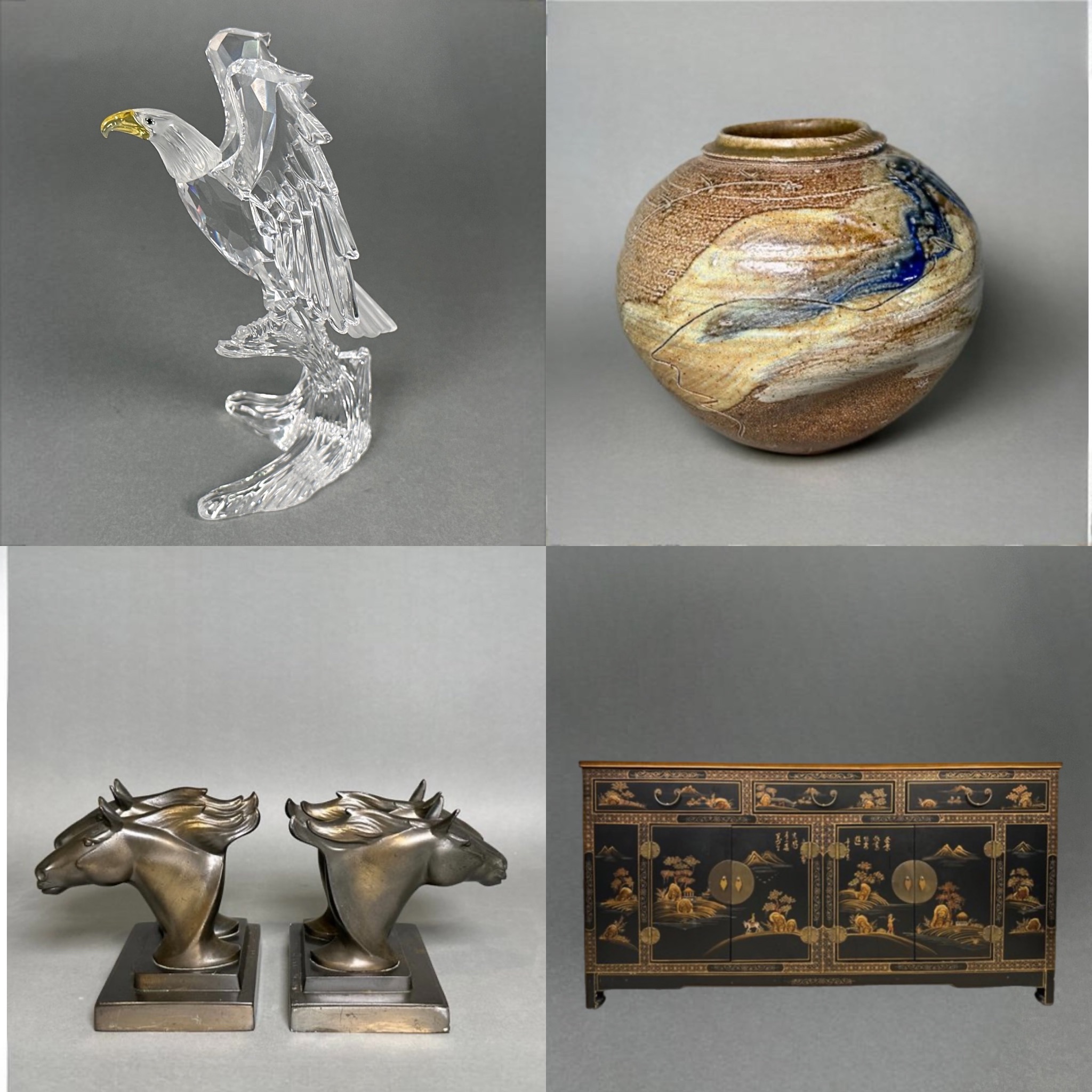 This is a mix of a few households, who are downsizing, as they transition to their new (smaller) homes. There are so many wonderful pieces — a mix of rustic decor, horse decor, Native American themes, Swarovski Crystal, wall art, lithographs, antique scales, cocktail glassware, copper, brass, kitchenware, carnival glass, figurines and so much more!