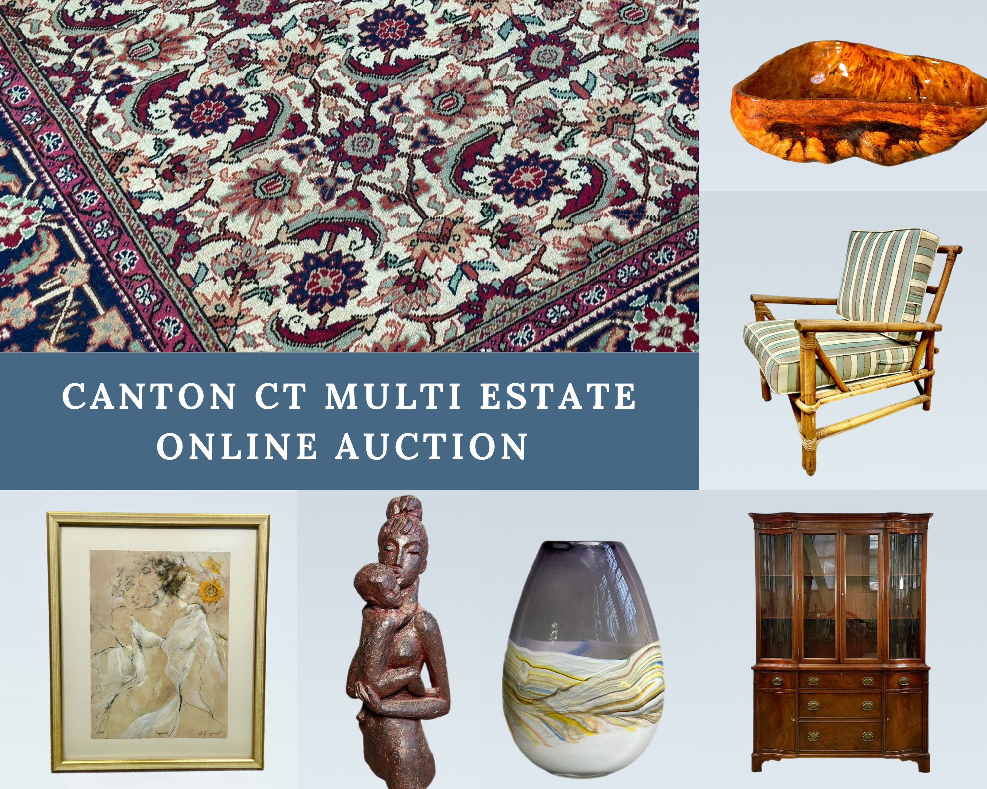 Explore the treasures from this beautiful home inside the LONG Estates in Bloomfield CT. This home is filled with an eclectic mix of styles including MCM, Danish Modern, Chinese, Japanese, Farmhouse Modern and Boho Chic! There is some amazing quality furniture, beautiful works of art, hand knotted rugs, unique decor, sterling silver, primitives, clocks, lamps, fishing and hunting art & decor, a great coin collection, vintage and antique treasures and many more great items! Have fun exploring this great variety and please reach out with any and all questions. Chris & Lauren 860-368-0122