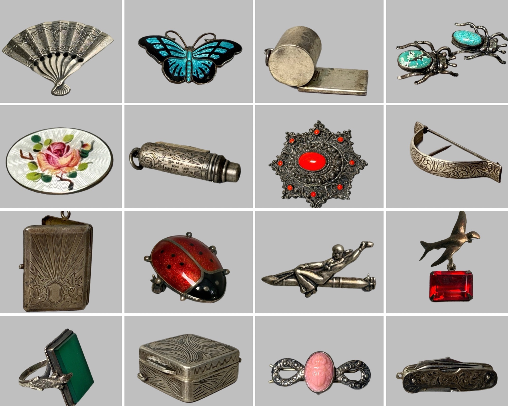 Explore this fabulous antique and vintage sterling silver collection filled with a variety of pieces. There are many enamel pieces from David Anderson, Aksel Holsmen, Volmer Bahner, Hroar Prydz and many more. Check out all of those enamel lady bugs and butterflies. There are some unique pieces including antique dance card holders, pocket knives, letter openers, a whistle, barrettes, brooch pins, pill boxes, pendants, necklaces, bracelets, corsage holders, folding scissors, pencil holder pendant, match case pendants, rings, cigar cutter, earrings and more! Pick up is in our warehouse in the Collins Axe Factory in Collinsville CT or we can mail to you in a flat rate box. Please reach out with any questions at all! Best of luck, Chris & Lauren 860-368-0122