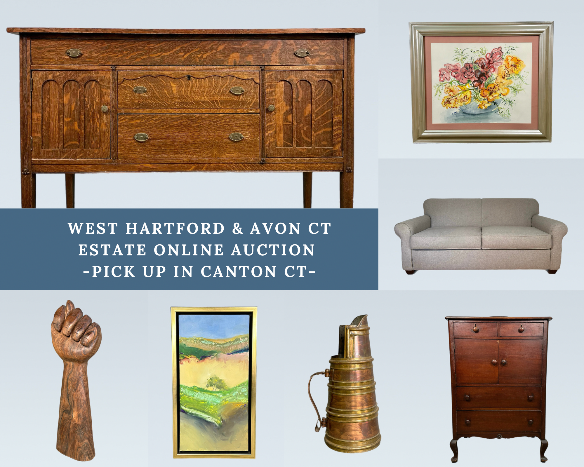 Explore the treasures from this beautiful home in Bloomfield CT! There is a lovely mix of furniture, MCM, sterling silver, art, jewelry, signed art glass, crystal, a stamp collection, China, housewares, outdoor furniture, Weber grill, antique and vintage collectibles, music related items such as an electric guitar and many more treasures. Don’t miss that Ethan Allen couch, it’s only 5 years old and beautiful. Please reach out with any and all questions. Thanks! Chris & Lauren (860-368-0122)