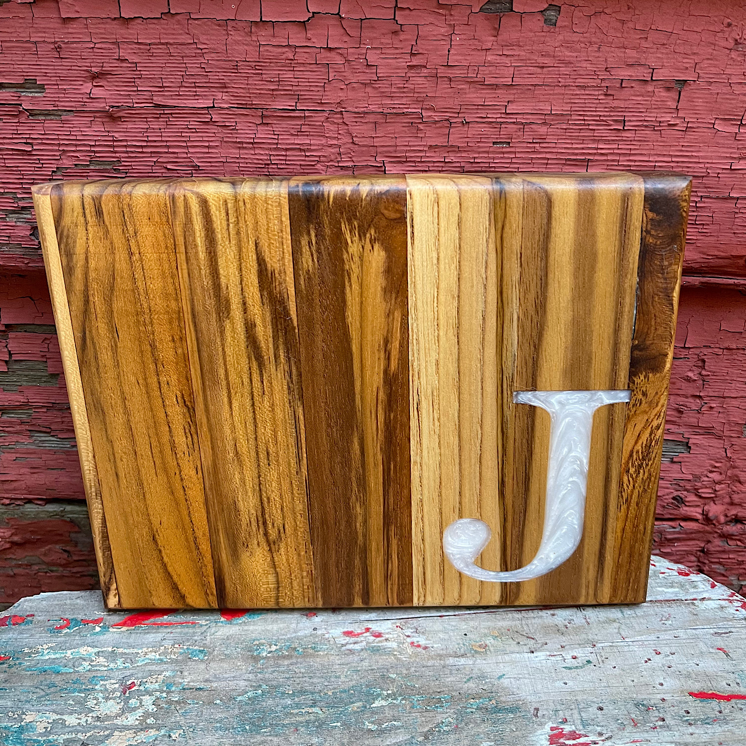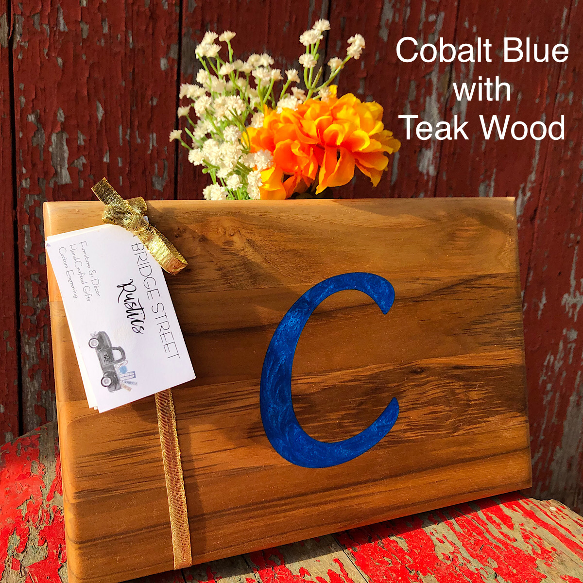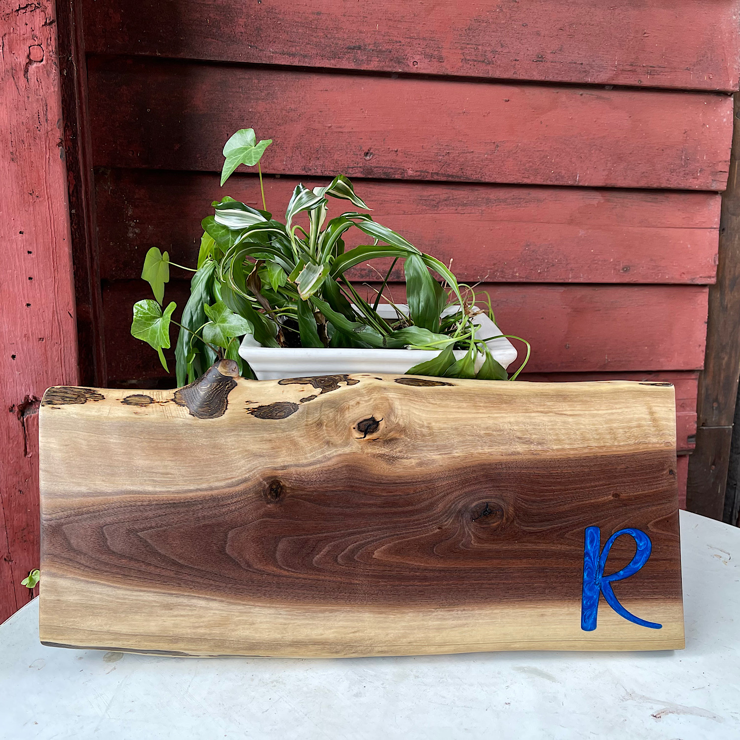 These look great as decor on your shelf and perfect for use as a serving board too! The letter looks best either in the middle or bottom right or left corner. If you choose the middle, we can do the letter big or smaller. We will send you a proof so you can decide! You can choose from just a light engraving or an engraving filled with colored resin. If you choose just the engraving, select "Not Applicable" under epoxy color choices.