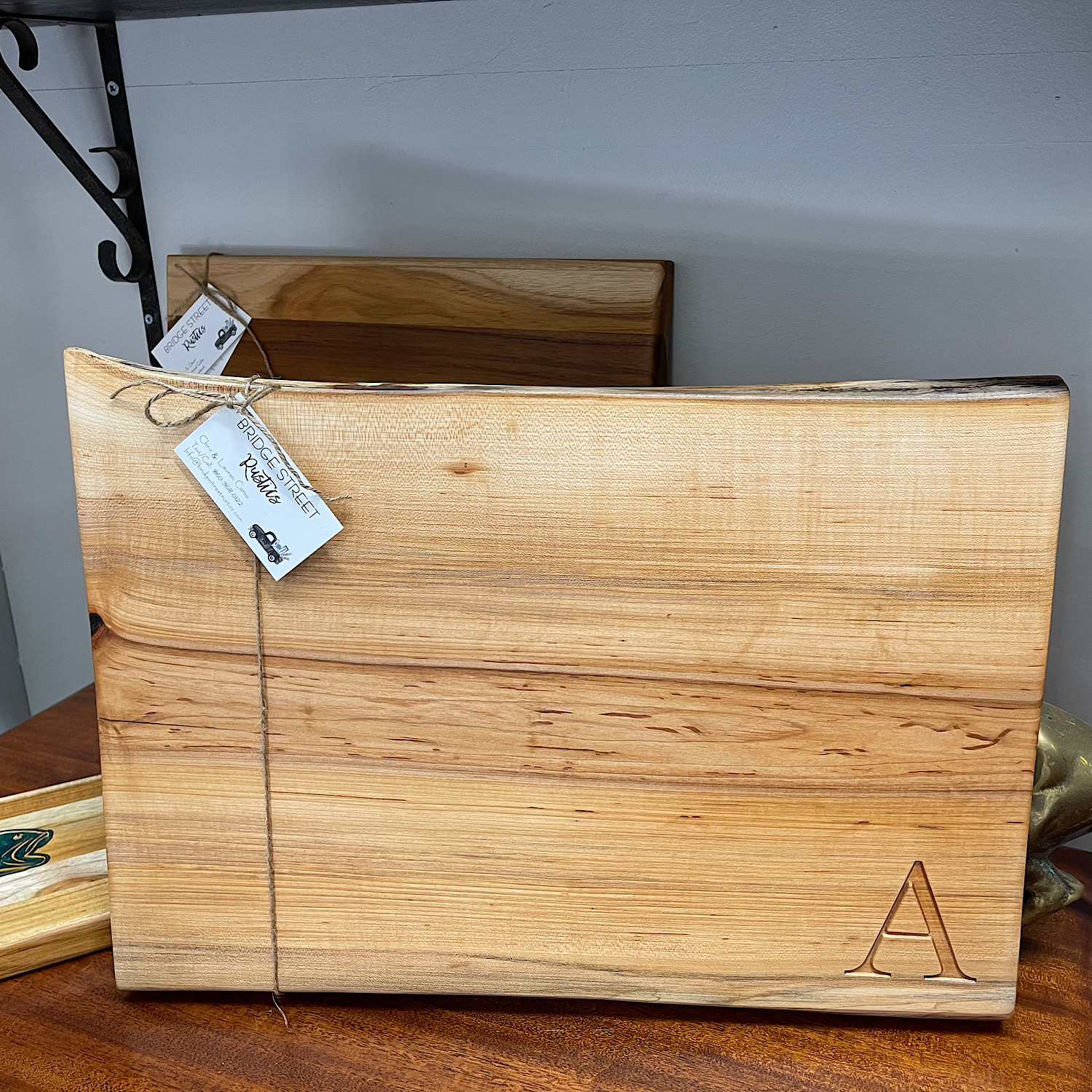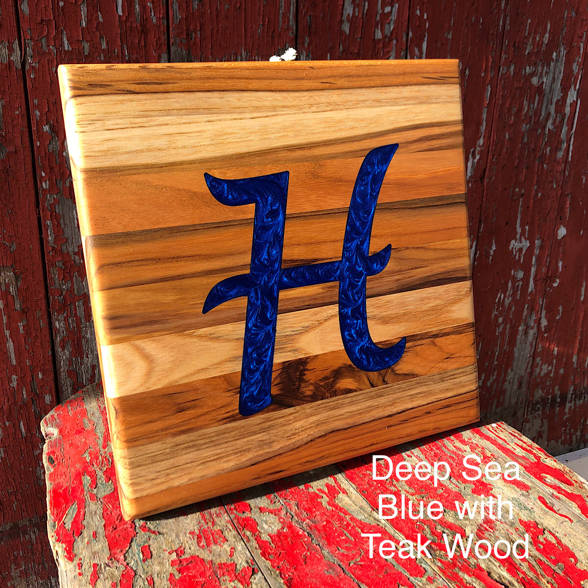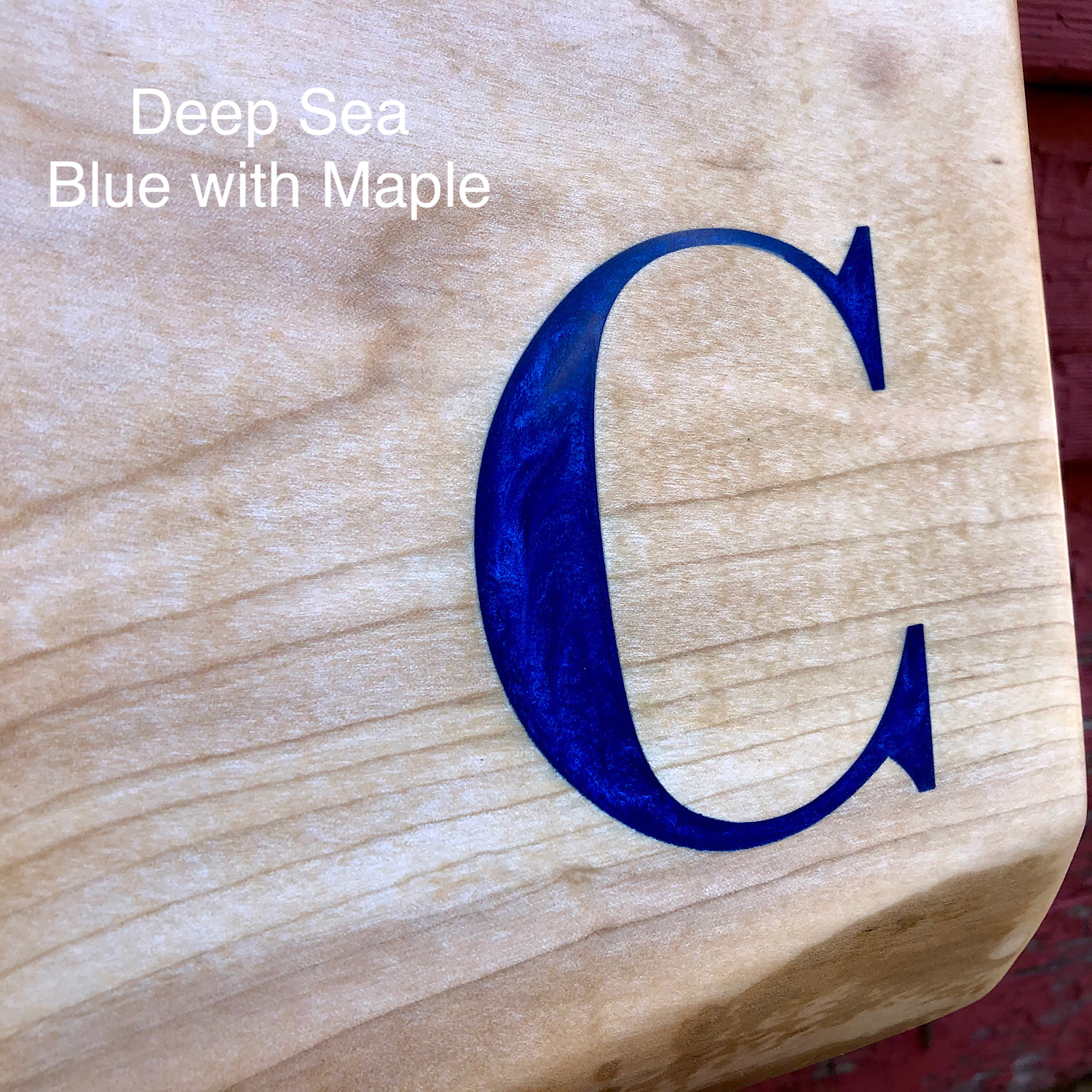 These look great as decor on your shelf and perfect for use as a serving board too! The letter looks best either in the middle or bottom right or left corner. If you choose the middle, we can do the letter big or smaller. We will send you a proof so you can decide! You can choose from just a light engraving or an engraving filled with colored resin. If you choose just the engraving, select "Not Applicable" under epoxy color choices.